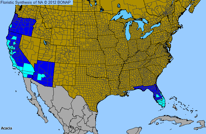 The acacia genus contains primarily tropical and subtropical trees and shrubs, native primarily to Australia and Africa. Species native to North America grow in the hot, arid SW region of the U.S. Leaves are bipinnately compound with small compact, light yellow flowers and numerous prominent stamens (male pollen-bearing structure), 10 or more. Since acacias are in the legume or pea family, the fruits are dry pods. The short-lived trees grow rapidly up to 50 feet in height. Powdered acacia gum or gum arabic is used to thicken foods and pharmaceuticals. Inhalation of the powder can cause allergic symptoms.